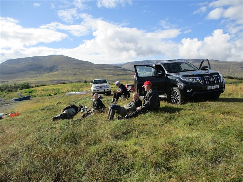 Nokkrir meðlima Græna bindisins njóta og slaka á í veðurbíðunni við Vesturhópsvatn, fimmtudaginn 28. ágúst 2025. |