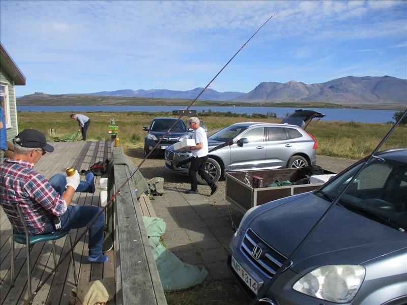 Svenni fylgist með Jóni S. Óla að burðast með frauðkassa í haustveiðiferð Græna bindisins í Vesturhópsvatn, mánud. 24. ágúst 2020.