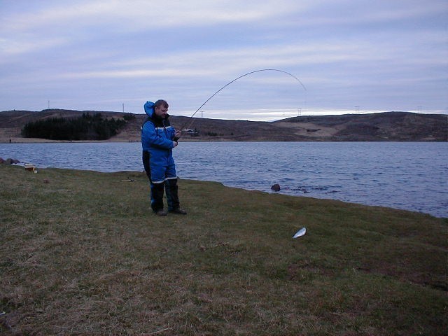 Jói Vigg búinn að landa fallegum silungi úr Reynisvatni í Grafarholti, föstudaginn 25. apríl 2003.